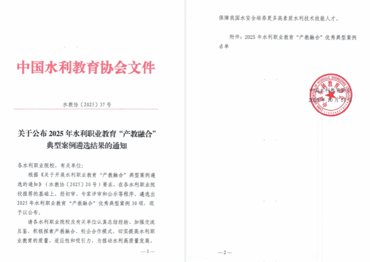近日,中国水利教育协会公布了2025年水利职业教育“产教融合”优秀典型案例遴选结果。由水利工程学院报送的《双擎驱动、四方协同、五位赋能:水利工程高水平专业群产教融合创新实践》、产教融合处报送的《产教融合筑牢双高建设之本,职教创新助力国家战略之进》、交通与测绘工程学院报送的《“六共携进 四维融合”校企行协同建设测绘地理信息产业学院的探索与实践》3项案例入选优秀典型案例。