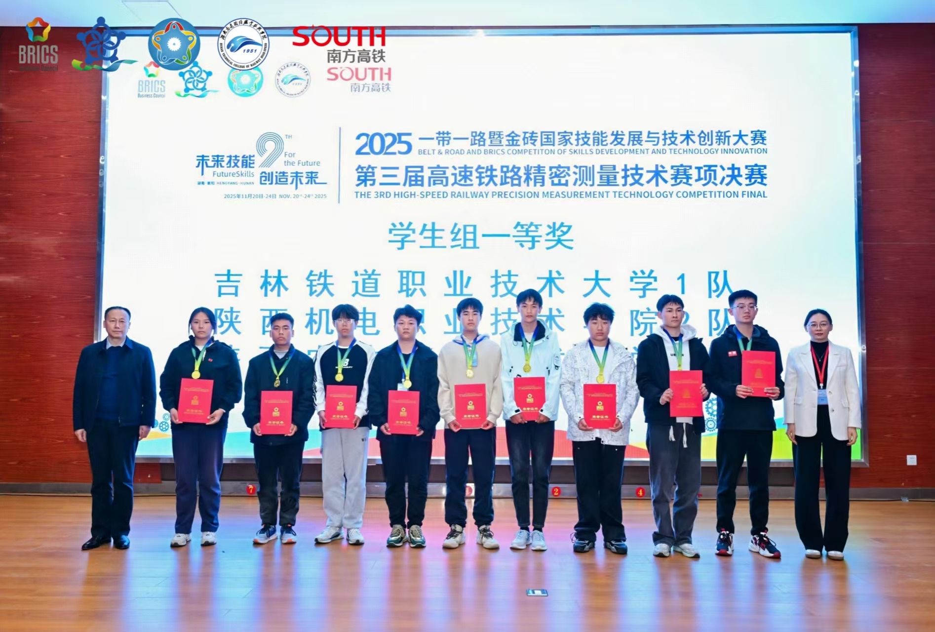 11月20日至24日,2025一带一路暨金砖国家技能发展与技术创新大赛第三届高速铁路精密测量技术赛项全国总决赛在湖南高速铁路职业技术学院落下帷幕。经过激烈角逐,由我校交通与测绘工程学院白广明、房海勃老师指导的两支学生队伍李坤坤、周贵平、王浩三位同学荣获大赛一等奖;聂菁康、张华东、华一冉荣获二等奖。