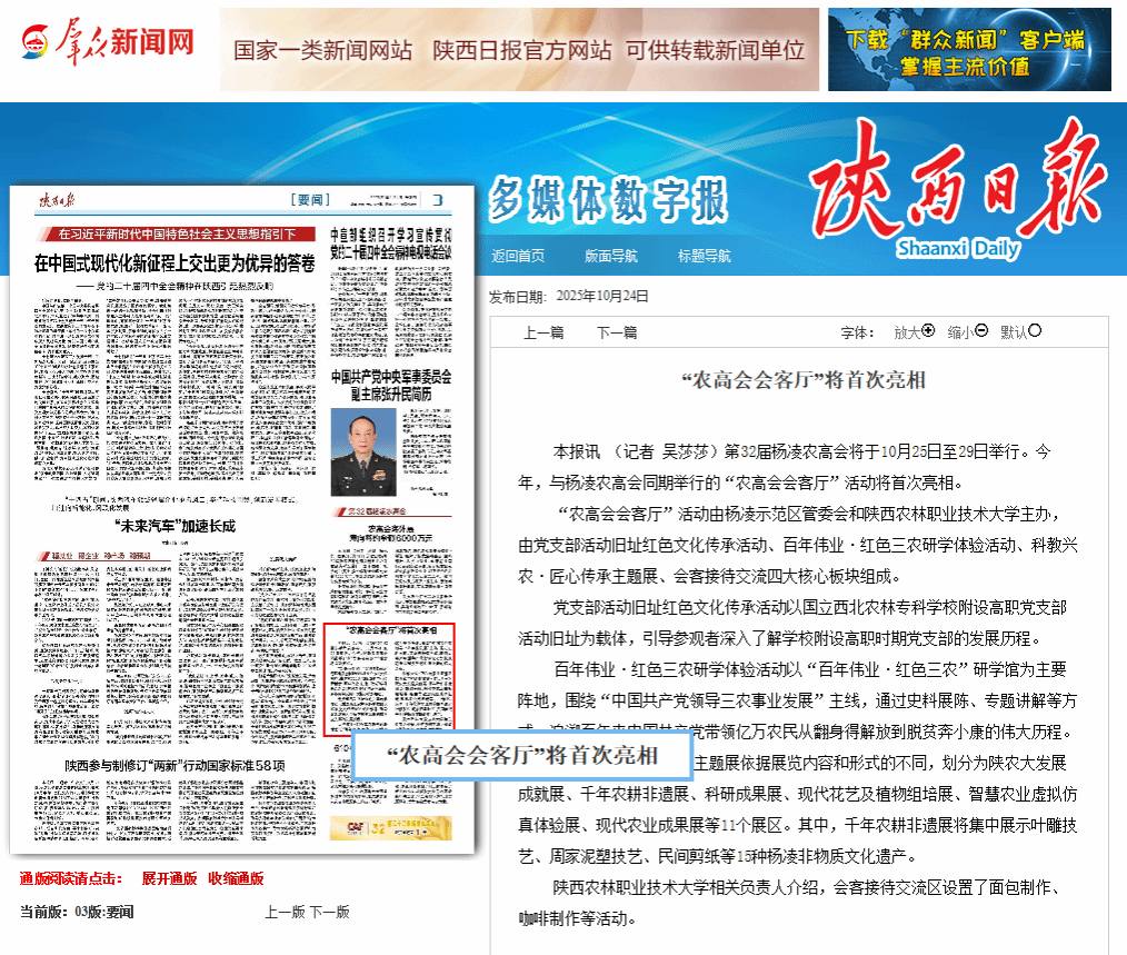 “农高会会客厅”活动由杨凌示范区管委会和陕西农林职业技术大学主办,由党支部活动旧址红色文化传承活动、百年伟业·红色三农研学体验活动、科教兴农·匠心传承主题展、会客接待交流四大核心板块组成。