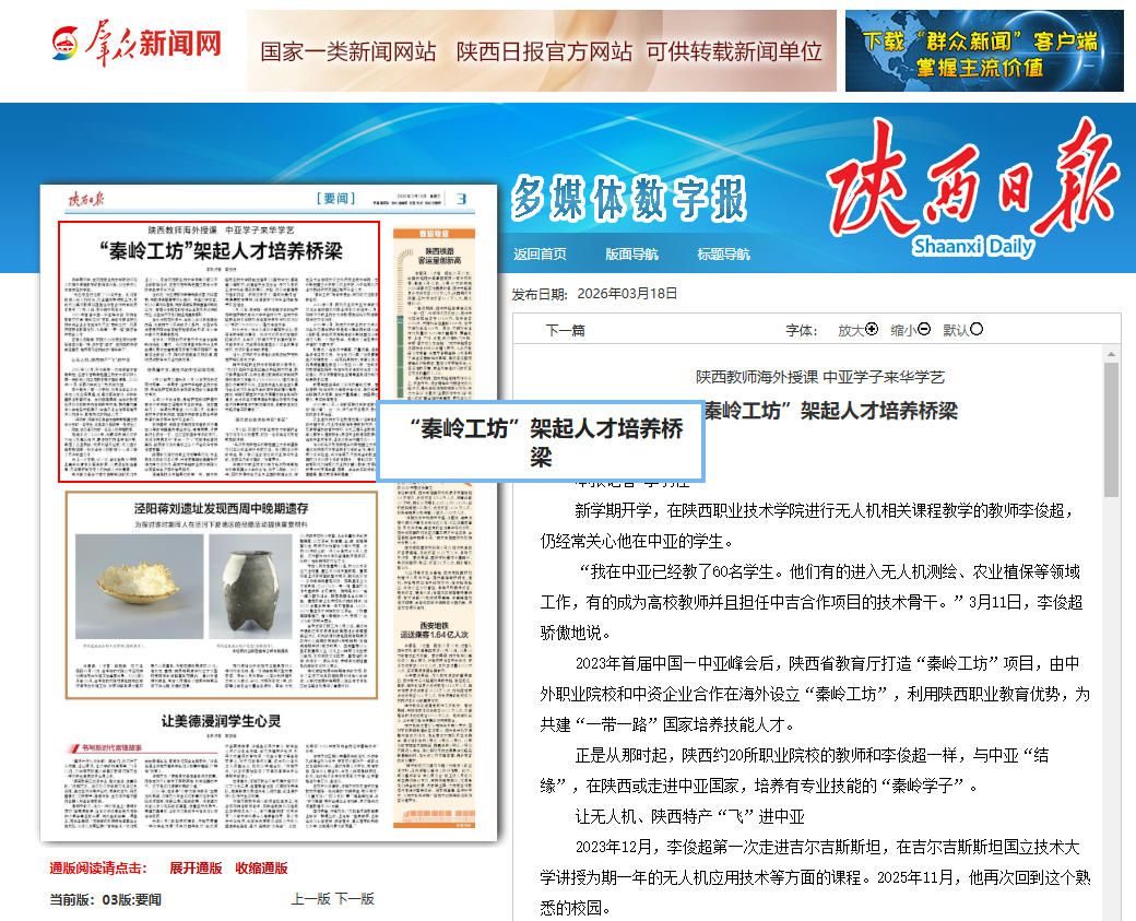 本报记者 李羽佳 新学期开学,在陕西职业技术学院进行无人机相关课程教学的教师李俊超,仍经常关心他在中亚的学生。 “我在中亚已经教了60名学生。他们有的进入无人机测绘、农业植保等领域工作,有的成为高校教师并且担任中吉合作项目的技术骨干。”3月11日,李俊超骄傲地说。